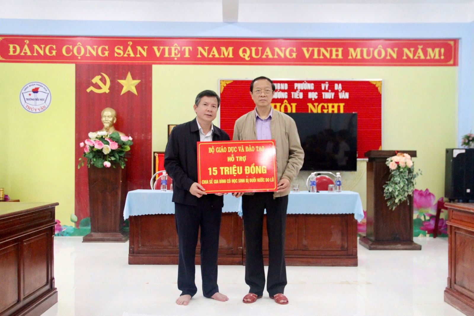 Thứ trưởng Thường trực Phạm Ngọc Thưởng trao hỗ trợ 100 triệu đồng cho Trường Tiểu học Thuỷ Vân, thành phố Huế