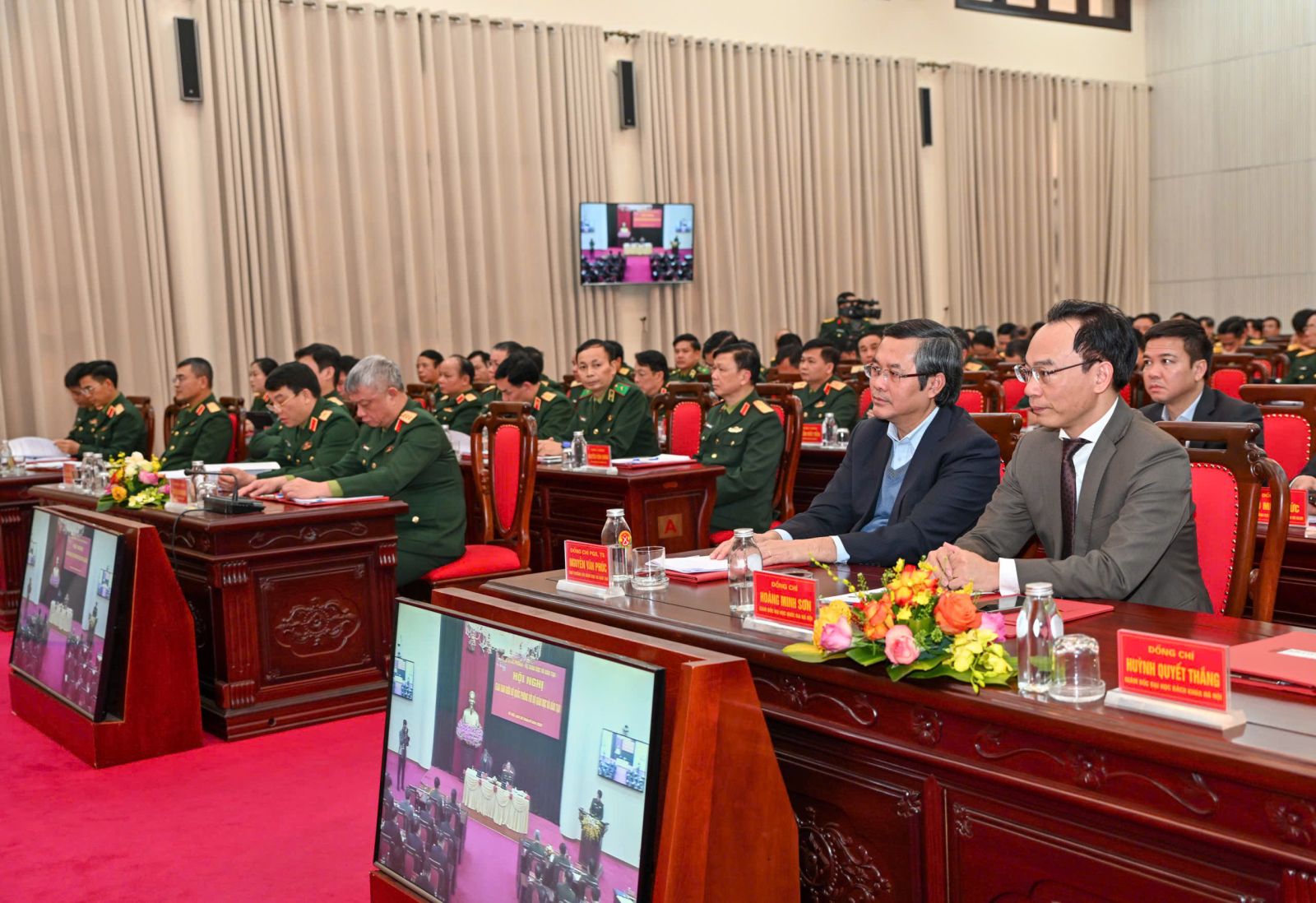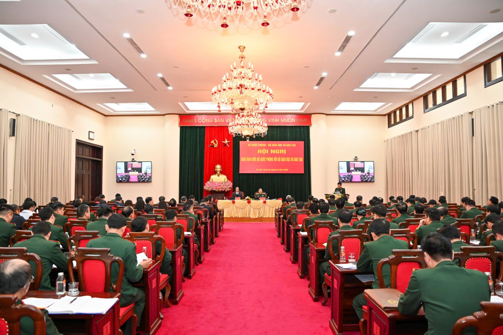 Đồng chí Nguyễn Kim Sơn - Ủy viên Trung ương Đảng, Bộ trưởng Bộ GDĐT và Đại tướng Nguyễn Tân Cương - Ủy viên Trung ương Đảng, Ủy viên Thường vụ Quân ủy Trung ương, Tổng Tham mưu trưởng QĐND Việt Nam, Thứ trưởng Bộ Quốc phòng đồng chủ trì hội nghị.