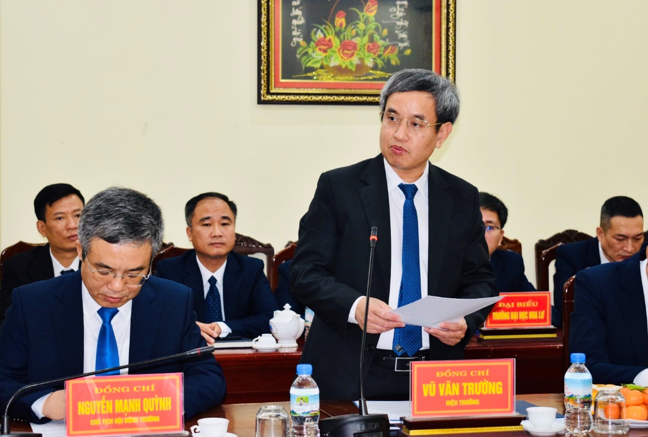 Ông Vũ Văn Trường, Hiệu trưởng Trường Đại học Hoa Lư, báo cáo tại buổi làm việc