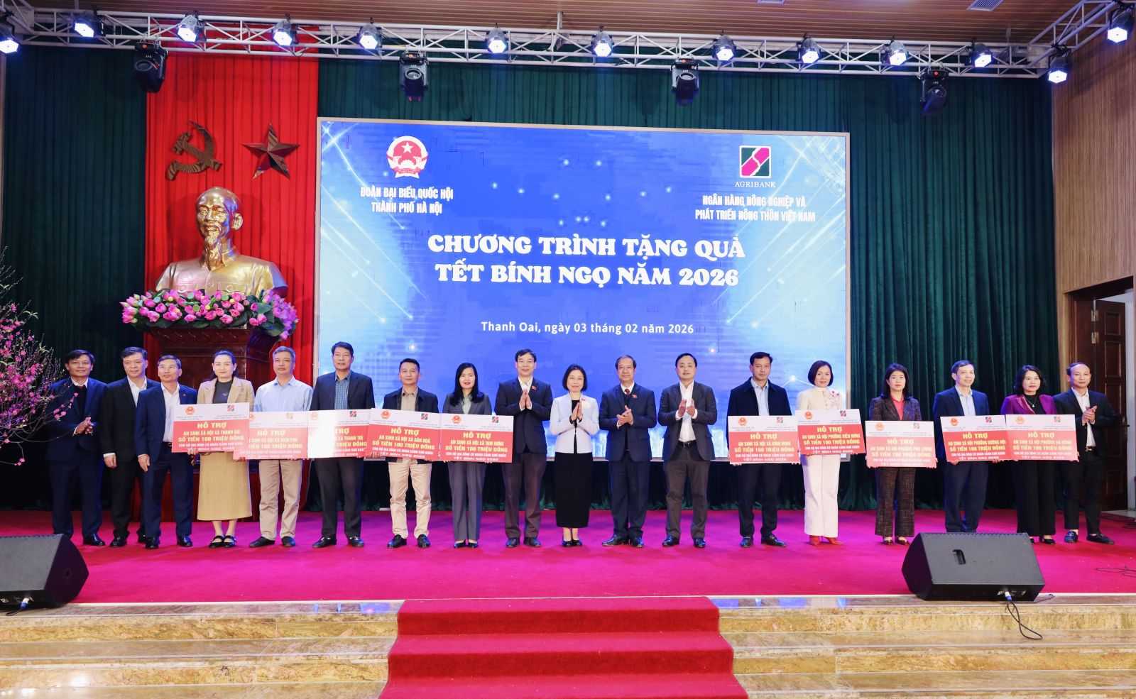 Chiều 3/2, tại trụ sở UBND xã Thanh Oai (Hà Nội), Tổ bầu cử số 6 – Đoàn đại biểu Quốc hội Thành phố Hà Nội đã phối hợp với Ngân hàng Nông nghiệp và Phát triển Nông thôn Việt Nam (Agribank) tổ chức Chương trình tặng quà Tết Bính Ngọ năm 2026 cho các gia đình có hoàn cảnh khó khăn trên địa bàn.