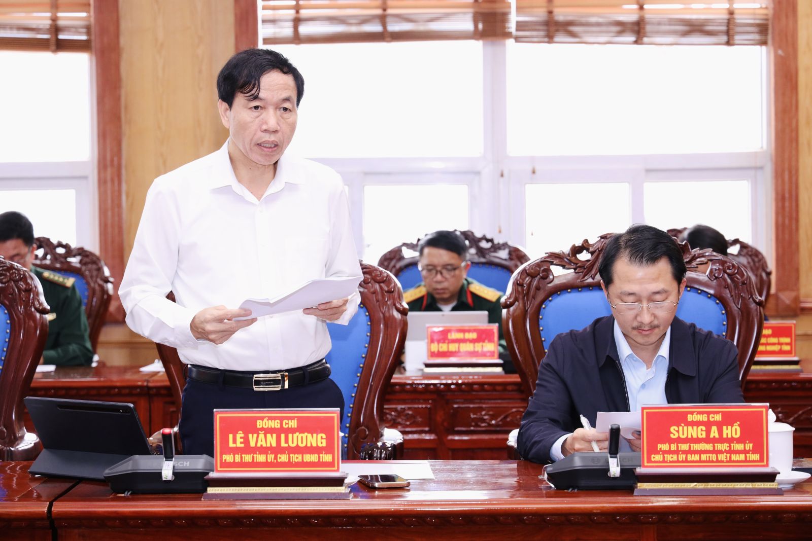 Chủ tịch UBND tỉnh Lai Châu Lê Văn Lương trao đổi tại buổi làm việc