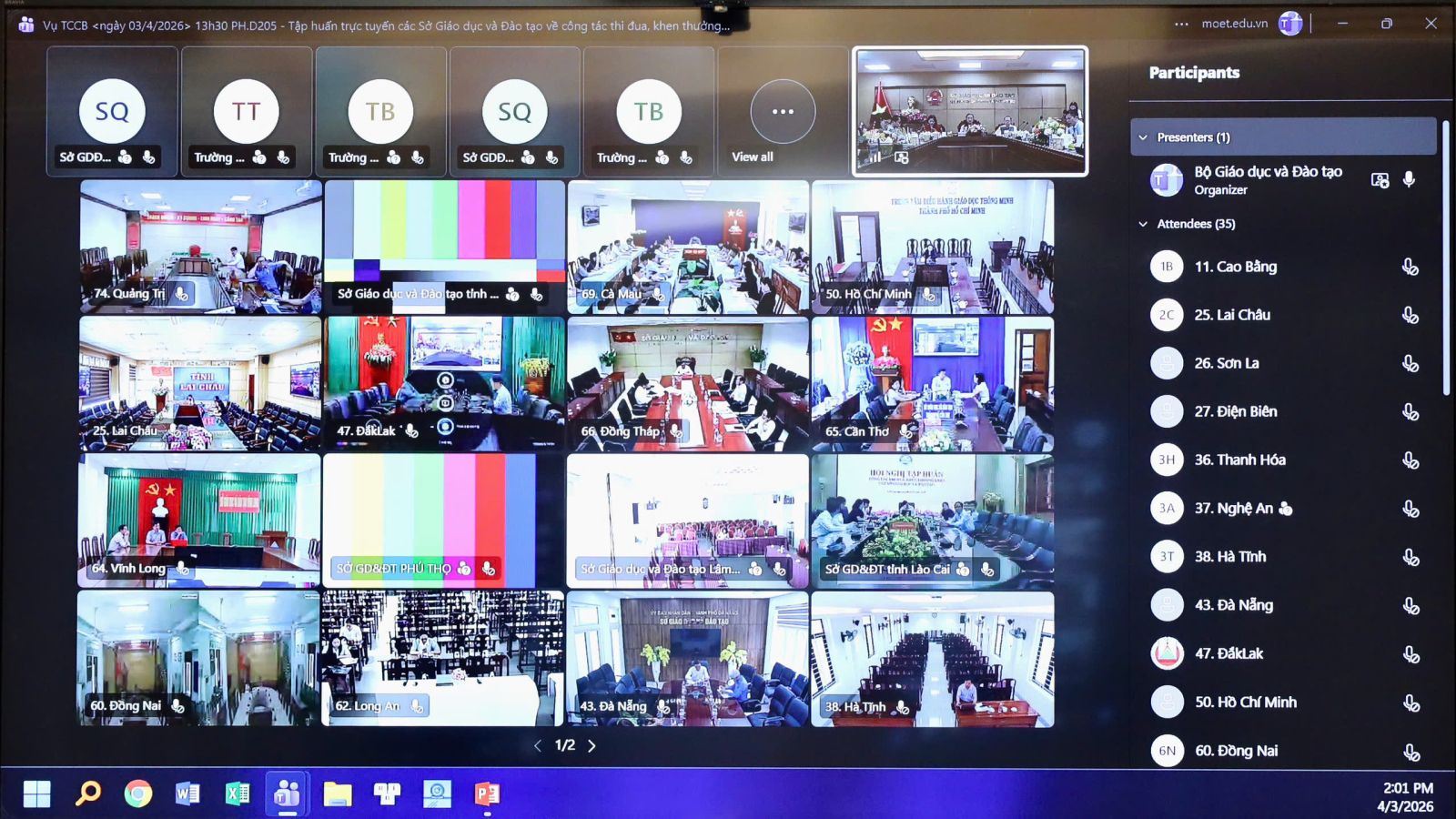 Chiều ngày 03/4, Bộ Giáo dục và Đào tạo (GDĐT) tổ chức Hội nghị tập huấn công tác thi đua, khen thưởng khối các Sở GDĐT. Hội nghị được tổ chức trực tiếp tại điểm cầu Bộ GDĐT và kết nối trực tuyến tới 34 điểm cầu các Sở GDĐT trên toàn quốc.