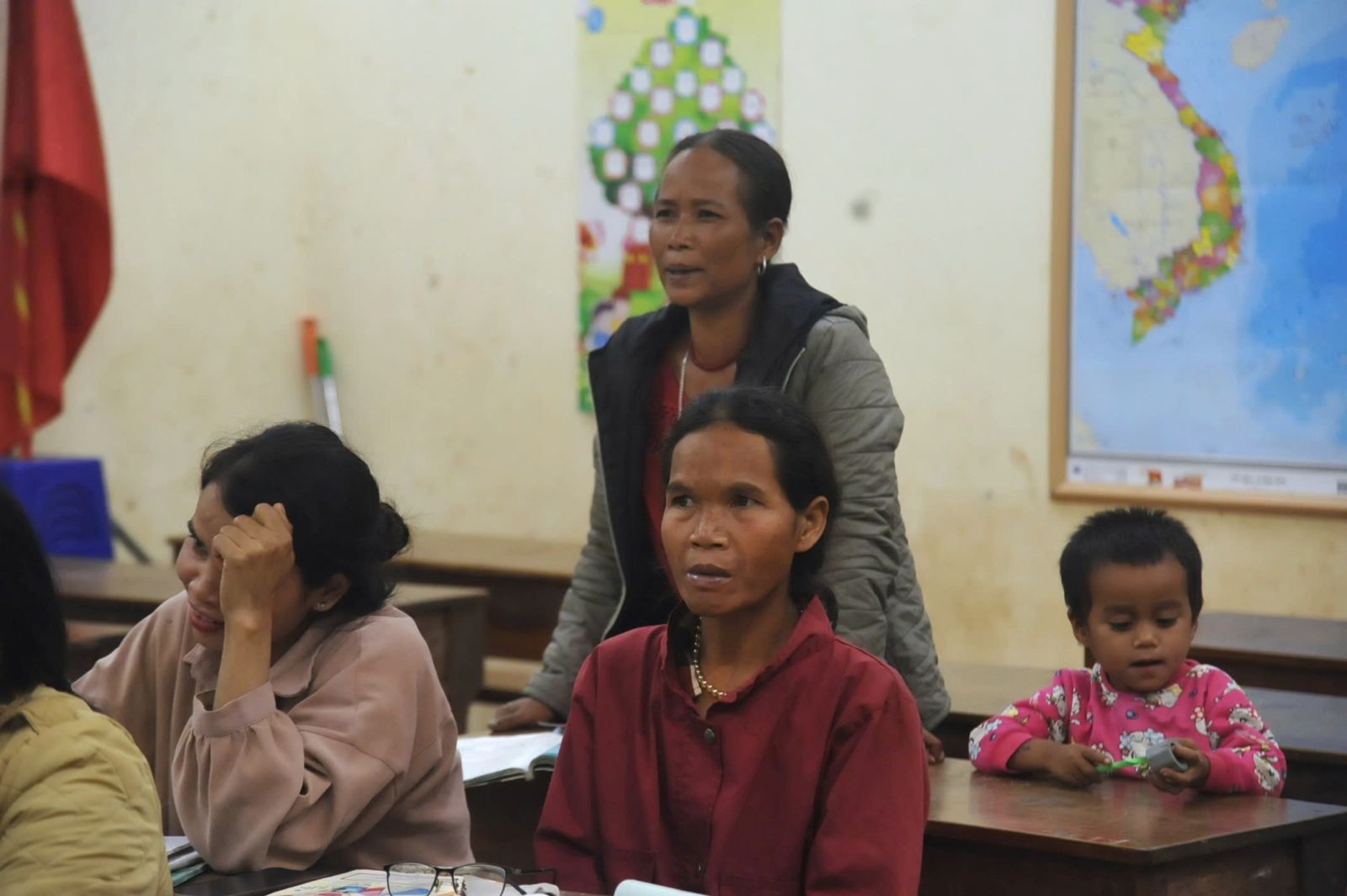 Nhiều em nhỏ theo mẹ đến lớp học xóa mù chữ