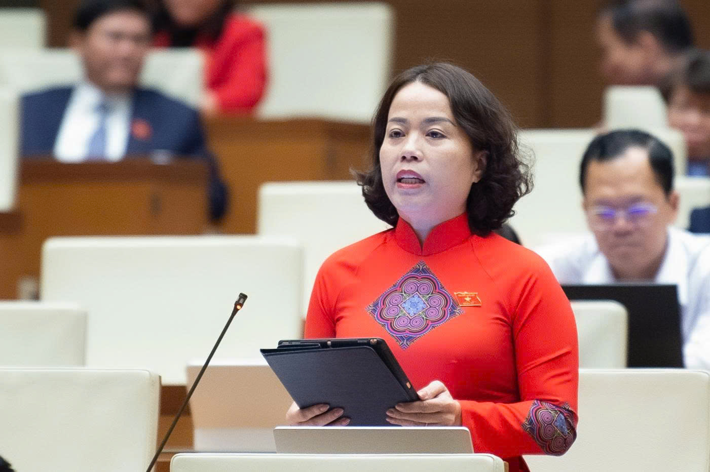 Về chính sách hỗ trợ người học, đại biểu Nguyễn Thị Lan Anh (Đoàn ĐBQH tỉnh Lào Cai) nêu rõ tình trạng tỷ lệ lao động qua đào tạo ở vùng đồng bào dân tộc thiểu số chỉ đạt 12–15%, cùng với tỷ lệ bỏ học cao do khó khăn về chi phí sinh hoạt trong thời gian học nghề. Đại biểu kiến nghị mở rộng đối tượng miễn học phí cho người Kinh sinh sống ở vùng đặc biệt khó khăn, biên giới, hải đảo hoặc hộ mới thoát nghèo; ưu tiên miễn học phí cho các ngành chế biến, chế tạo, vi mạch, sinh học, vật liệu mới.