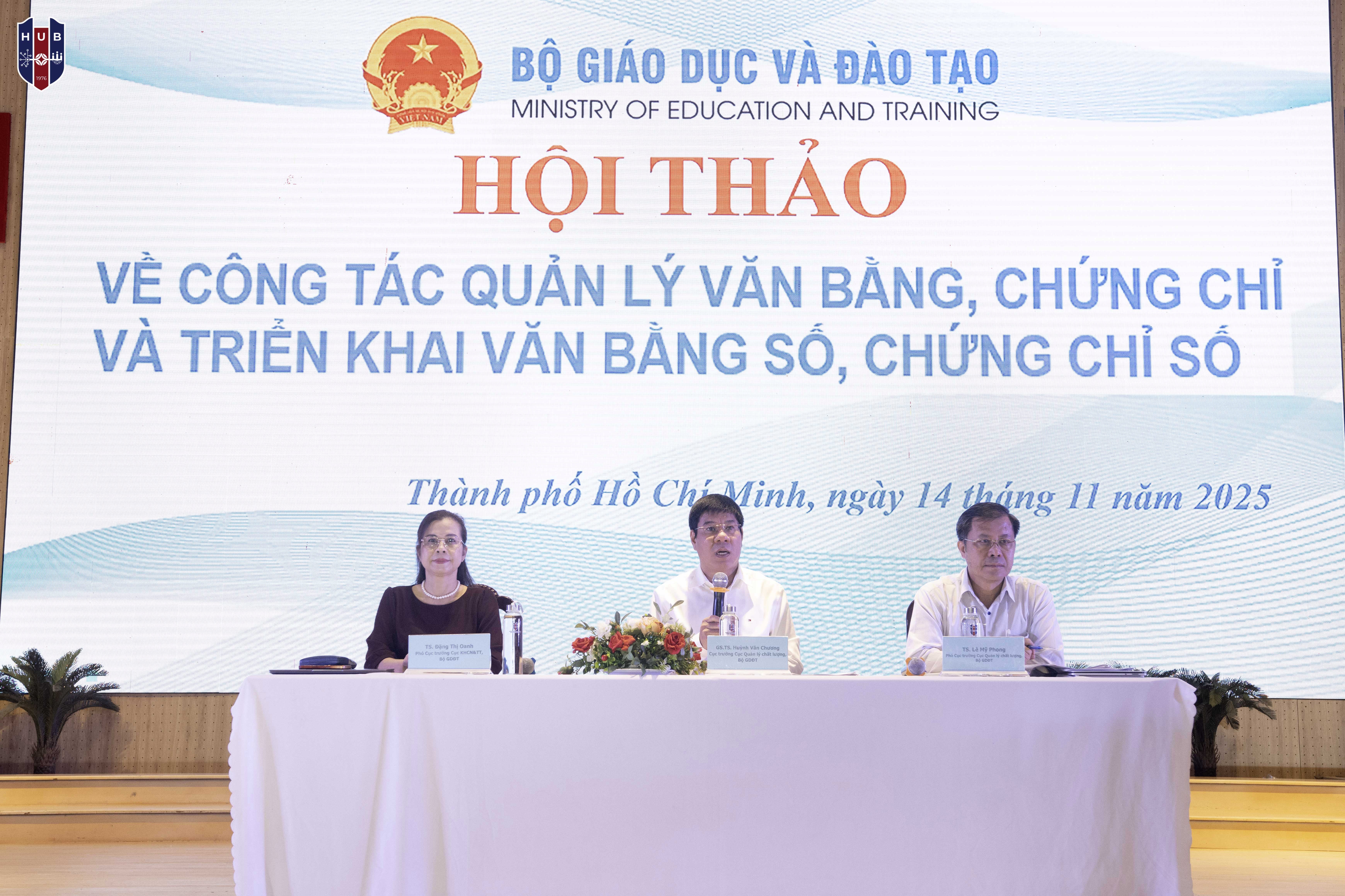 Sáng ngày 14/11/2025, tại Trường Đại học Ngân hàng TP. Hồ Chí Minh (HUB), Bộ Giáo dục và Đào tạo (GDĐT) đã tổ chức Hội thảo về công tác quản lí văn bằng, chứng chỉ (VBCC) và triển khai văn bằng số, chứng chỉ số, với sự tham dự của lãnh đạo các đơn vị thuộc Bộ GDĐT cùng đại diện các cơ sở giáo dục đại học khu vực phía Nam.