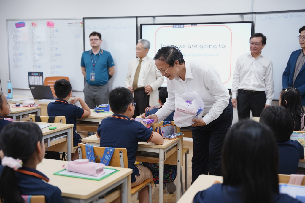 Trong chương trình, Thứ trưởng Thường trực đã đến thăm lớp 4.2, trò chuyện cùng học sinh về tình hình học tập, vui chơi và việc thực hiện 5 điều Bác Hồ dạy. Thứ trưởng động viên, tặng quà và gửi gắm mong muốn mỗi ngày đến trường của các em đều là một ngày vui.