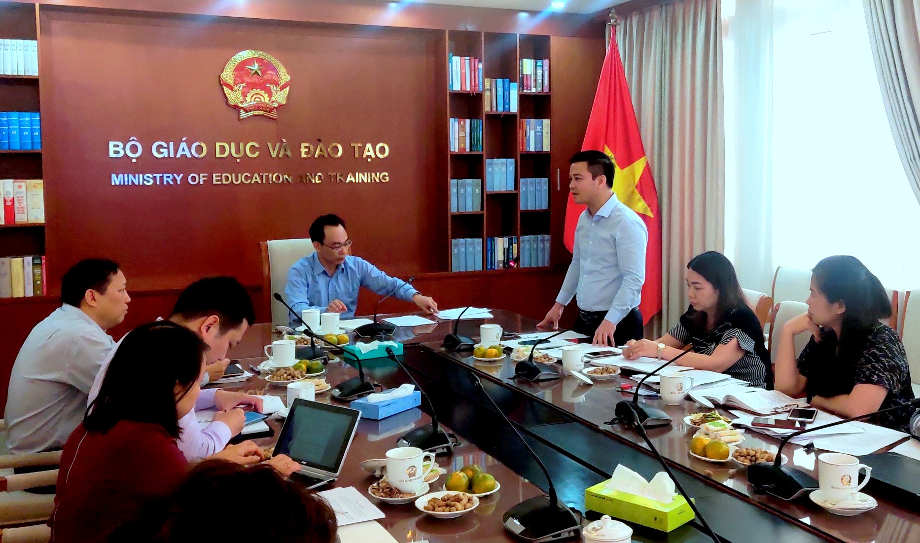 Chánh Văn phòng Bộ GDĐT Trần Quang Nam báo cáo tại cuộc họp