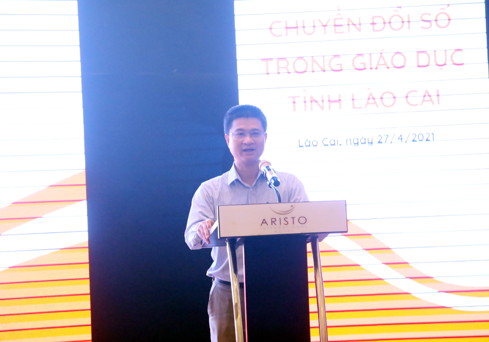 Đại diện cho Cục Công nghệ thông tin (Bộ Giáo dục và Đào tạo), đồng chí Tô Hồng Nam, Phó Cục trưởng Cục Công nghệ thông tin trình bày tham luận về thực trạng ứng dụng CNTT, chuyển đổi số và thảo luận một số định hướng chuyển đổi số trong giáo dục đào tạo tại các địa phương nói chung, Lào Cai nói riêng. Tham luận của Cục CNTT khái quát một số kết quả nổi bật của toàn ngành thời gian qua về hoàn thiện cơ chế chính sách, về triển khai hệ thống CSDL toàn ngành và kho học liệu số dùng chung, phát huy hiệu quả tích cực nhất là trong thời gian diễn ra dịch Covid-19. Chuyển đổi số phải góp phần thực hiện mục tiêu nâng cao chất lượng dạy-học, giảm chi phí và mở ra cơ hội học tập cho ngày càng nhiều người trong xã hội. Thời gian tới, Bộ GDĐT sẽ trình Thủ tướng Chính phủ phê duyệt Đề án tăng cường ứng dụng CNTT và chuyển đổi số GDĐT giai đoạn 2021-2025, định hướng đến 2030.