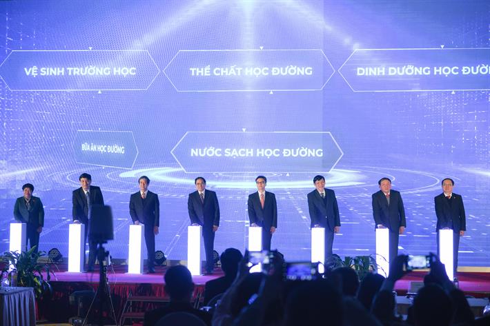 Thủ tướng Phạm Minh Chính, Phó Thủ tướng Vũ Đức Đam cùng lãnh đạo các Ủy ban của Quốc hội và các Bộ nhấn nút công bố Chương trình sức khỏe học đường giai đoạn 2021-2025