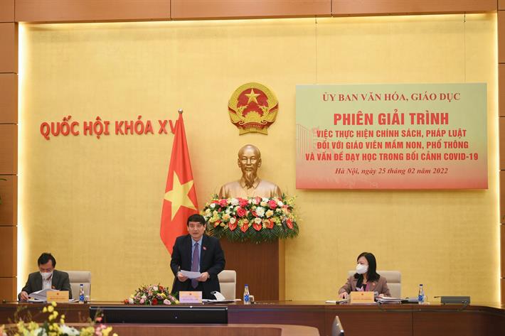 Tham dự và trực tiếp báo cáo giải trình có Bộ trưởng Bộ Giáo dục và Đào tạo (GDĐT) Nguyễn Kim Sơn, Bộ trưởng Bộ Nội vụ Phạm Thị Thanh Trà, Thứ trưởng Bộ GDĐT Nguyễn Hữu Độ.