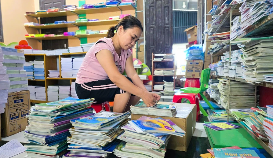 Đầu năm học, cô Hòa đi thu mua sách cũ về gói lại từng tập để tặng học sinh nghèo