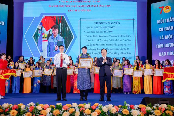 Kỷ niệm 42 năm Ngày Nhà giáo Việt Nam, 70 năm truyền thống ngành Giáo dục Thủ đô, Sở Giáo dục và Đào tạo (GDĐT) Hà Nội tổ chức trao giải thưởng "Nhà giáo Hà Nội tâm huyết, sáng tạo" lần thứ 8, năm 2024. Là gương mặt trẻ nhất được vinh danh lần này, thầy Nguyễn Hữu Quyết (SN 1998) đến từ Trường THPT Huỳnh Thúc Kháng, quận Thanh Xuân không giấu nổi niềm vinh dự và tự hào.