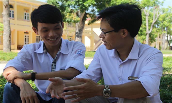 Phút thư giãn của thầy chủ nhiệm Lê Văn Đạt và học trò Đình Nguyên. Ảnh: Lê Hoàng.