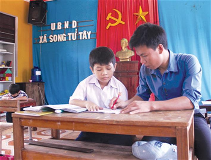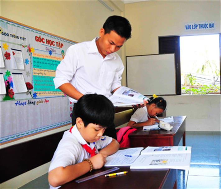 Thầy giáo trẻ Lê Xuân Quyết bên học trò của mình trong một tiết học tại Trường tiểu học Song Tử Tây.