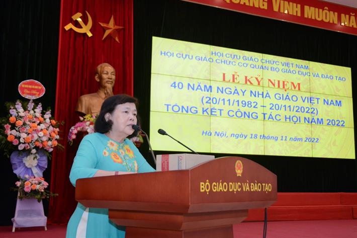 Tại buổi lễ, Nhà giáo nhân dân, Tiến sĩ Đặng Huỳnh Mai, Chủ tịch hội Cựu giáo chức cơ quan Bộ GDĐT báo cáo tổng kết công tác hội năm 2022 và cho biết: 40 năm qua, từ khi còn bao cấp, ngày Nhà giáo Việt Nam 20/11 đã trở thành ngày lễ chính thức của ngành giáo dục, ngày của các nhà giáo, ngày “tôn sư trọng đạo” với mục đích tôn vinh những hoạt động trong ngành GDĐT, để các thế hệ học trò bày tỏ lòng biết ơn sâu sắc đối với thầy cô giáo của mình bằng những món quà tình thần ý nghĩa. Đồng thời, đây cũng là dịp để ngành giáo dục ở tất cả các cấp, các nhà trường đánh giá lại hoạt động dạy chữ, dạy người, lập phương hướng và giải pháp nâng cao chất lượng hoạt động giáo dục cho năm học tiếp theo.