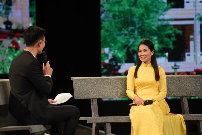 Cô giáo Nguyễn Thị Hà, Trường THPT Phan Đình Giót, tỉnh Điện Biên kể về hành trình "nuôi em" trên sân khẩu chương trình "Thay lời tri ân"
