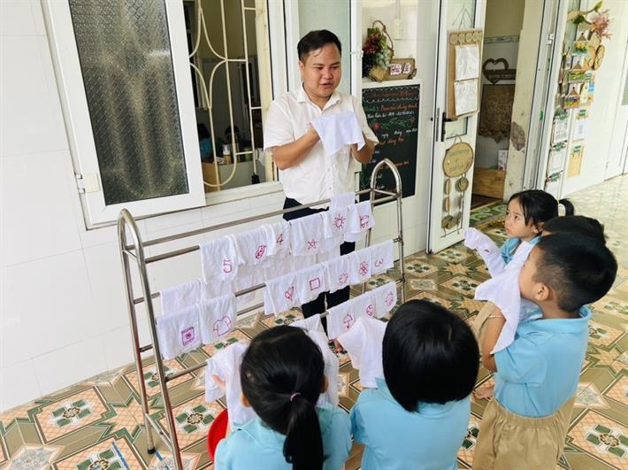 Đó cũng là chia sẻ của cô Hiệu trưởng Đặng Thị Nguyệt khi phân công thầy Tuyến đứng lớp. Cô Nguyệt cho rằng, nhiều phụ huynh băn khoăn chuyện trẻ mầm non chưa chủ động vệ sinh cá nhân, nhất là lớp có nhiều bé gái, nên trao gửi con cả ngày cho thầy giáo, cha mẹ không an tâm.