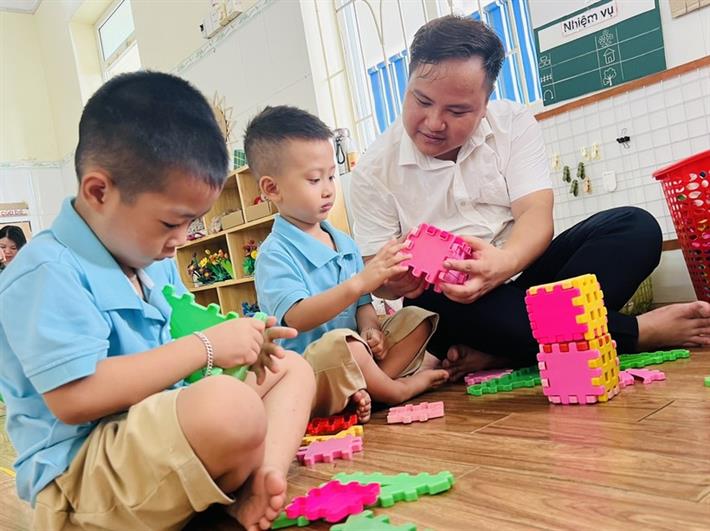 Thậm chí, thời gian đầu, có nhiều phụ huynh kiên quyết không gửi con ở lớp có thầy giáo. Nhưng để hài hòa công tác chuyên môn, nhà trường luôn khéo léo, linh hoạt trong xếp lớp. Lớp có 2 giáo viên, vì thế song hành cùng thầy Tuyến sẽ có nữ giáo viên.