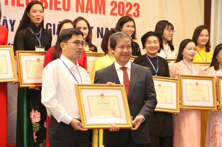 Bộ trưởng Bộ GDĐT Nguyễn Kim Sơn trao bằng khen cho thầy giáo Hà Văn Thạo