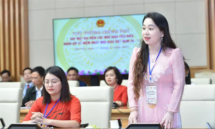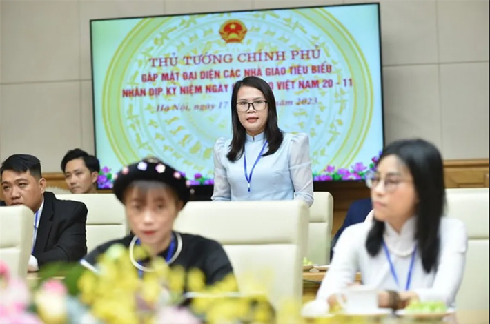 Cô giáo Nguyễn Thúy Duyên phát biểu tại buổi Thủ tướng gặp mặt đại diện các nhà giáo tiêu biểu - chiều 17/11/2023