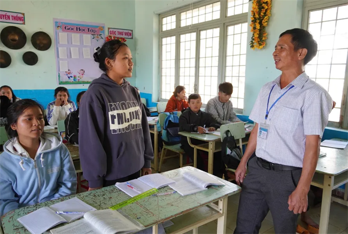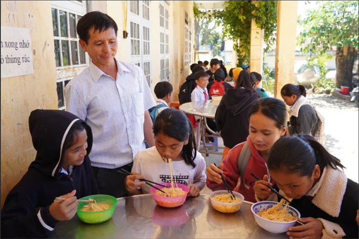 Không muốn học sinh thất học, từ năm 2021 thầy Trần Ngọc Mạnh, Hiệu trưởng Trường THCS xã Đăk Môn tự bỏ tiền túi tổ chức bữa trưa để giữ chân các em ở trường. Thời gian đầu, kinh phí còn hạn chế nên thầy Mạnh mua mì gói để nấu cho học sinh ăn trưa, rồi ở lại trường để chiều tiếp tục học chữ.