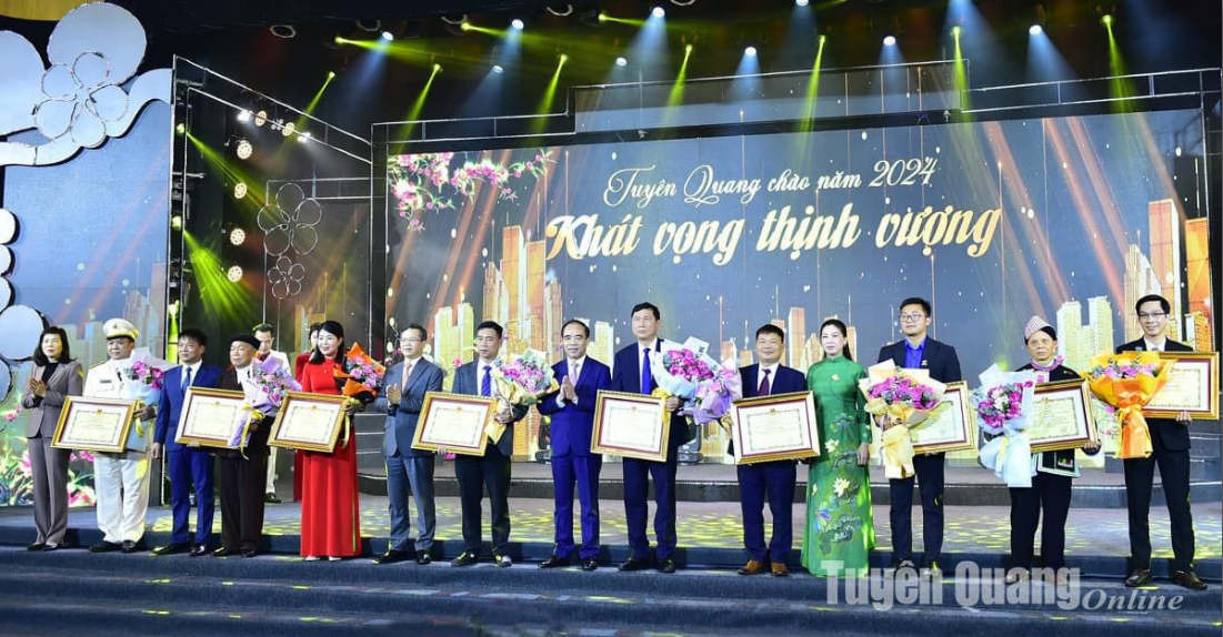 Thầy giáo Hoàng Châu Thiện (người đứng đầu tiên từ phải sang trái) tại Lễ vinh danh “Công dân tiêu biểu của tỉnh Tuyên Quang” năm 2023