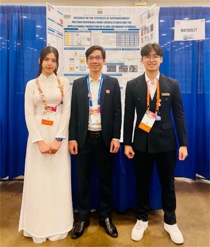 Thầy Hoàng Châu Thiện và các em học sinh tham gia Hội thi khoa học kỹ thuật Quốc tế năm 2023 được tổ chức tại Hoa Kỳ