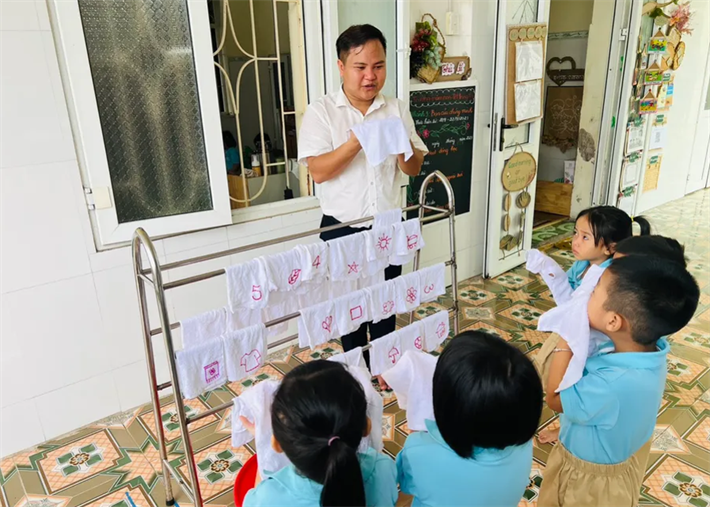 Thầy Tuyến dạy học sinh cách vệ sinh cá nhân