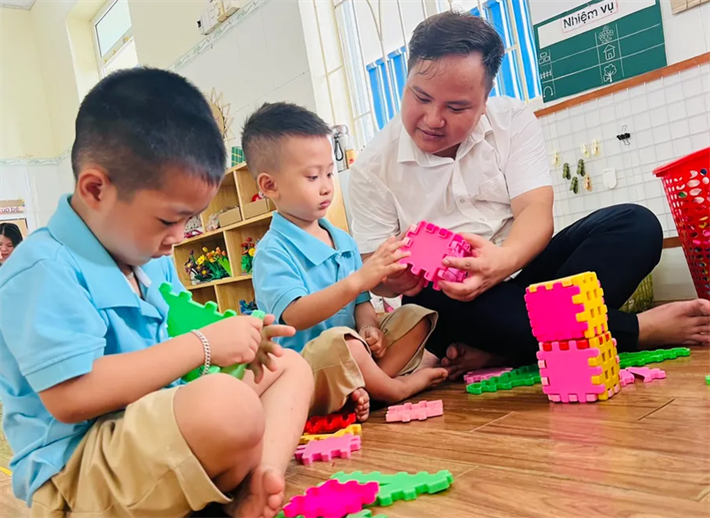 Thậm chí, thời gian đầu, có nhiều phụ huynh kiên quyết không gửi con ở lớp có thầy giáo. Nhưng để hài hòa công tác chuyên môn, nhà trường luôn khéo léo, linh hoạt trong xếp lớp. Lớp có 2 giáo viên, vì thế song hành cùng thầy Tuyến sẽ có nữ giáo viên.