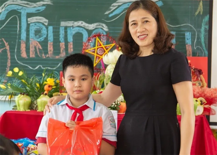 Cô Lê Thị Nga trao quà trung thu cho học sinh nhà trường