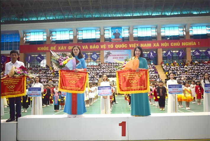 Cô Lê Thị Nga (đứng giữa) thay mặt tập thể nhà trường nhận Giải Nhất Hội khỏe Phù Đổng cấp thành phố