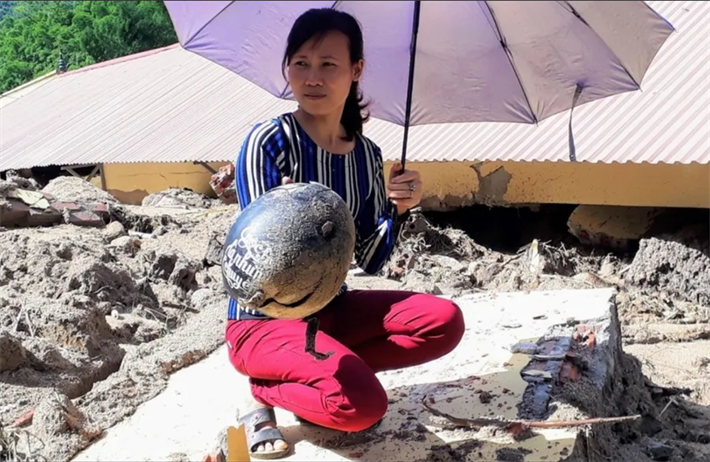 Cô giáo Nguyễn Thị Thanh Hiền (vợ thầy giáo Can) nhặt nhạnh những gì còn sót lại sau trận lũ lịch sử tràn qua huyện Mường Lát hồi tháng 10/2018