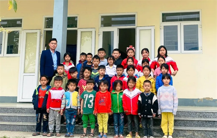 Thầy giáo Cầm Bá Can và những học sinh của mình ở điểm trường bản Lìn, xã Trung Lý, huyện Mường Lát (Thanh Hóa)