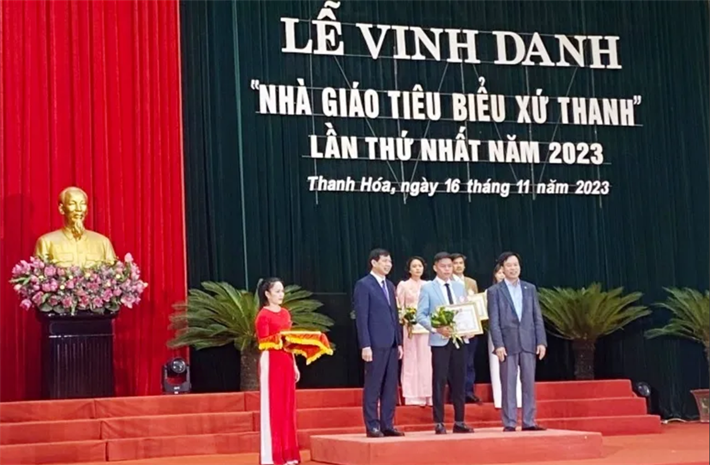 Thầy giáo Cầm Bá Can (người ôm hoa) tại Lễ vinh danh Nhà giáo tiêu biểu xứ Thanh lần thứ nhất năm 2023.