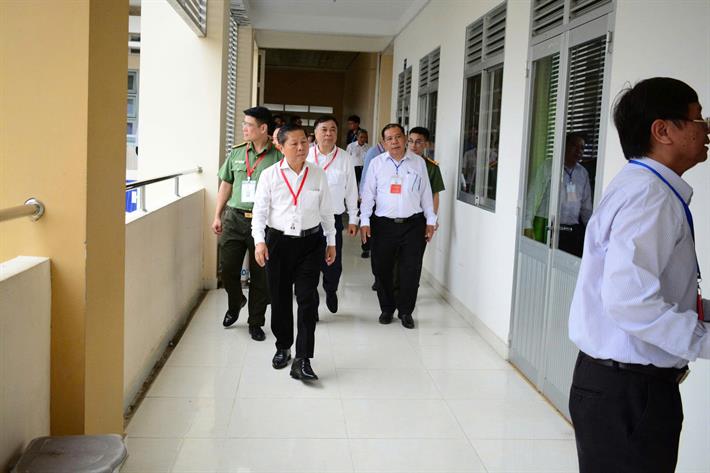 Thứ trưởng Bộ GDĐT Lê Tấn Dũng (bìa phải) kiểm tra cơ sở vật chất tại địa điểm thi