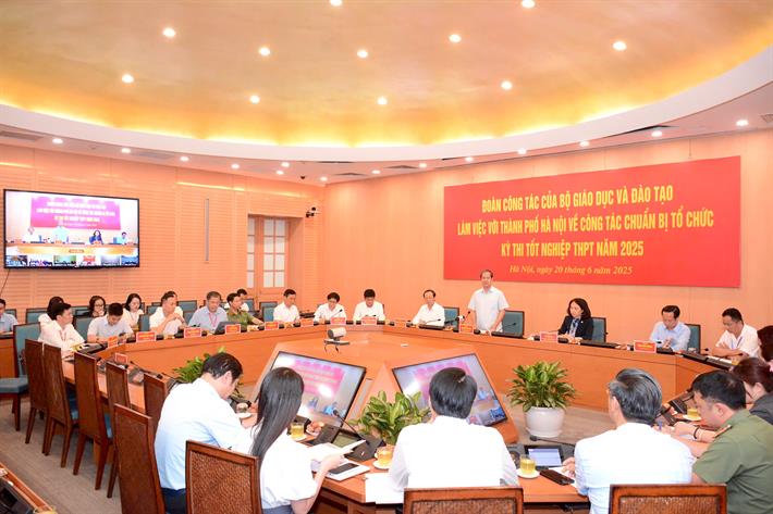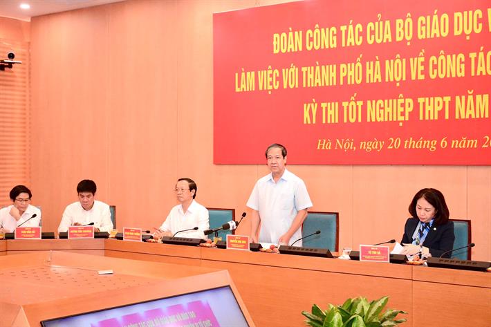 Bộ trưởng Bộ GDĐT Nguyễn Kim Sơn đánh giá cao công tác chuẩn bị của thành phố Hà Nội, triển khai công việc theo đúng yêu cầu của Ban Chỉ đạo quốc gia, thể hiện sự chu đáo, chuyên nghiệp, dù Hà Nội đối mặt với nhiều thách thức hơn các tỉnh, thành khác.