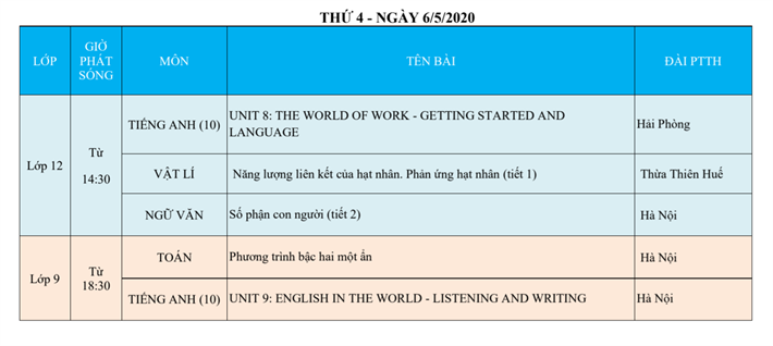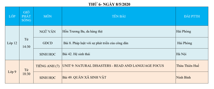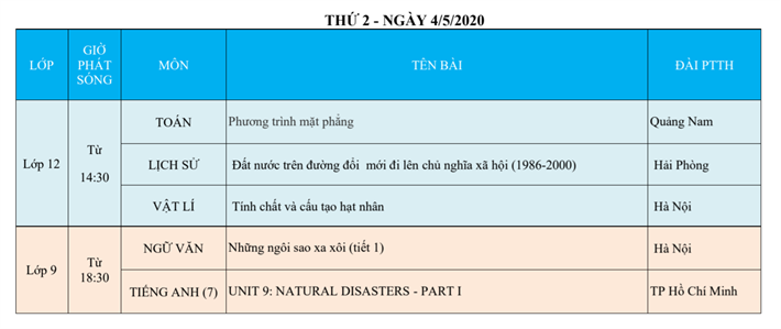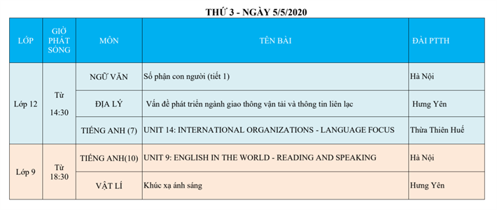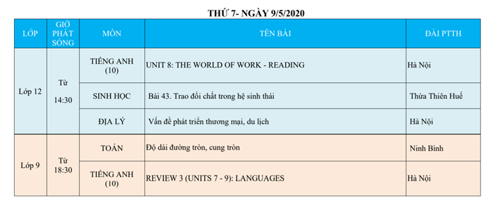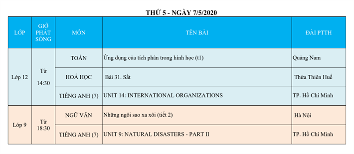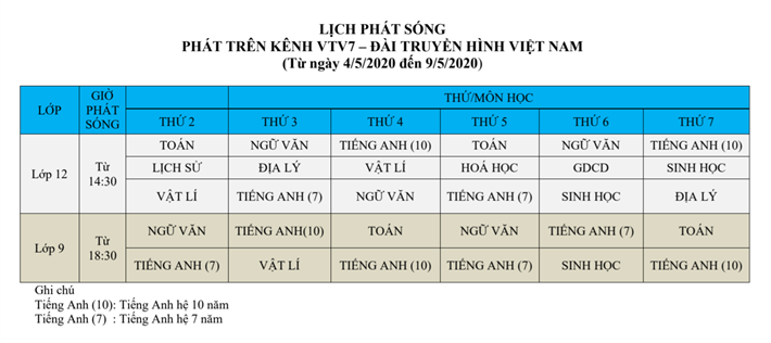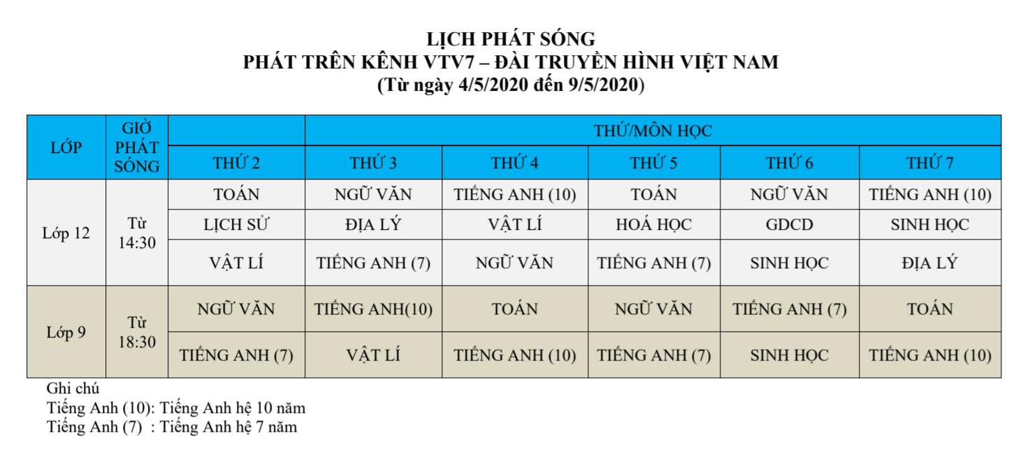 Lịch phát sóng dạy học trên truyền hình VTV7 (Từ ngày 04/5 đến 09/5/2020)