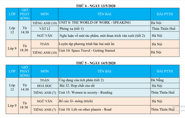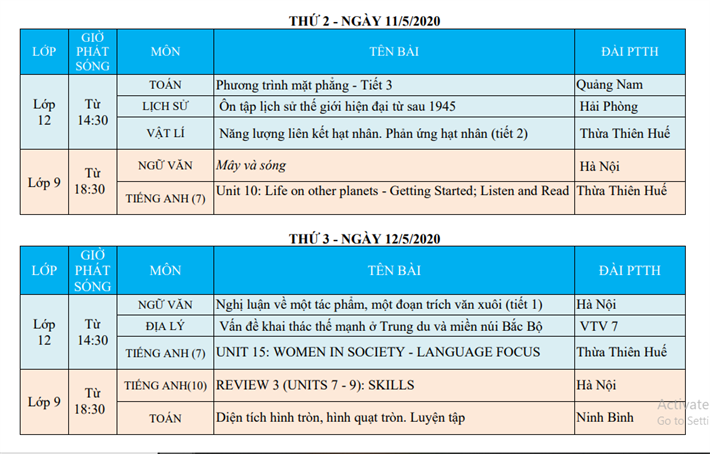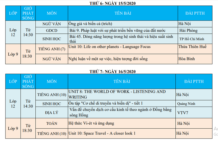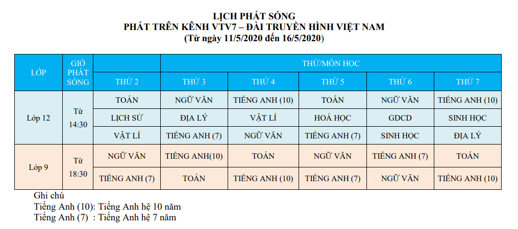 Lịch phát sóng dạy học trên truyền hình VTV7 (Từ ngày 11/5 đến 16/5/2020)