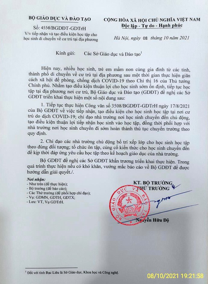 Nhằm tạo điều kiện thuận lợi cho học sinh sớm ổn định, tiếp tục học tập tại địa phương nơi cư trú, Bộ GDĐT đề nghị các Sở GDĐT tiếp tục thực hiện Công văn số 3508/BGDĐT-GDTrH ngày 17/8/2021 của Bộ GDĐT về việc tiếp nhận, tạo điều kiện cho học sinh học tập tại nơi cư trú do dịch COVID-19.