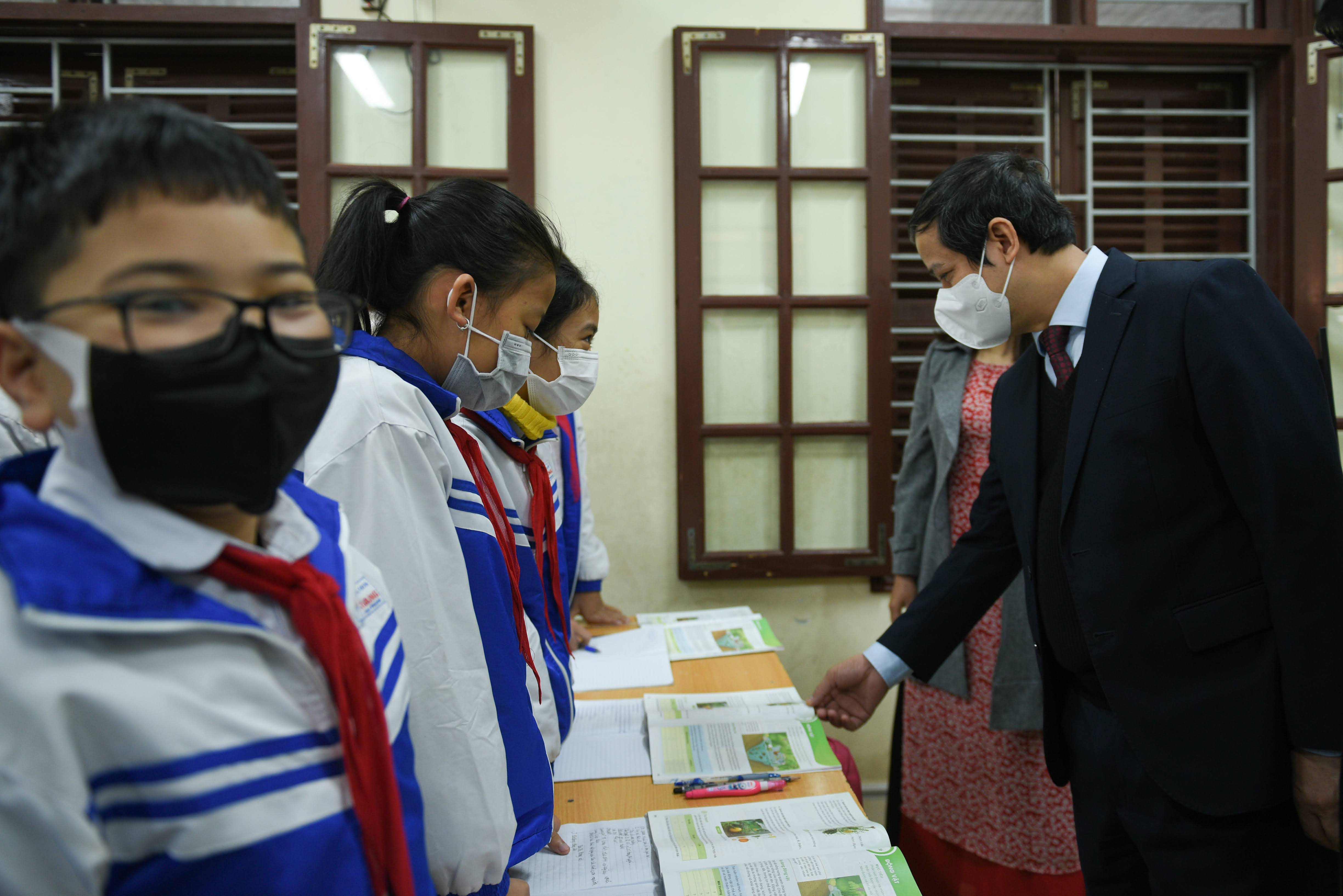 Kiểm tra tại các lớp học và trò chuyện với giáo viên, hiệu trưởng nhà trường, Bộ trưởng Nguyễn Kim Sơn ghi nhận sự quyết tâm cũng như công tác triển khai các điều kiện để mở cửa trường học của Trường Tiểu học Minh Tân, đặc biệt các em học sinh lớp 1 đã được đi học trực tiếp từ trước Tết Nguyên đán.