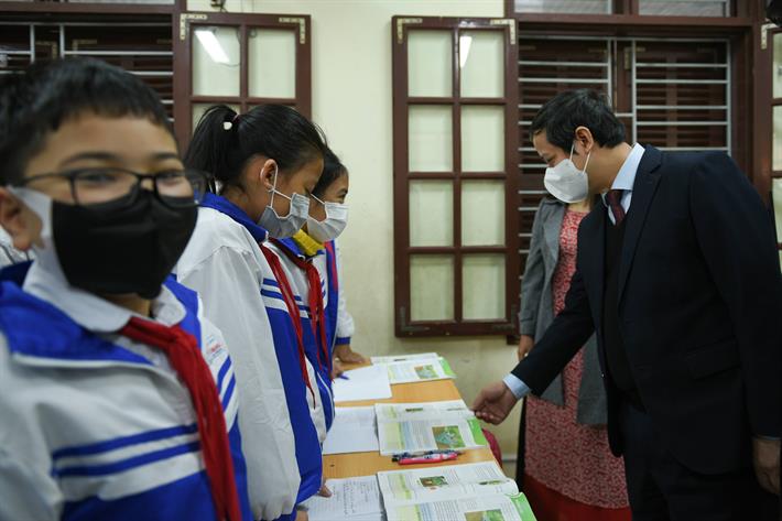Bộ trưởng Nguyễn Kim Sơn thăm lớp học tại Trường Tiểu học Minh Tân (huyện Thủy Nguyên)