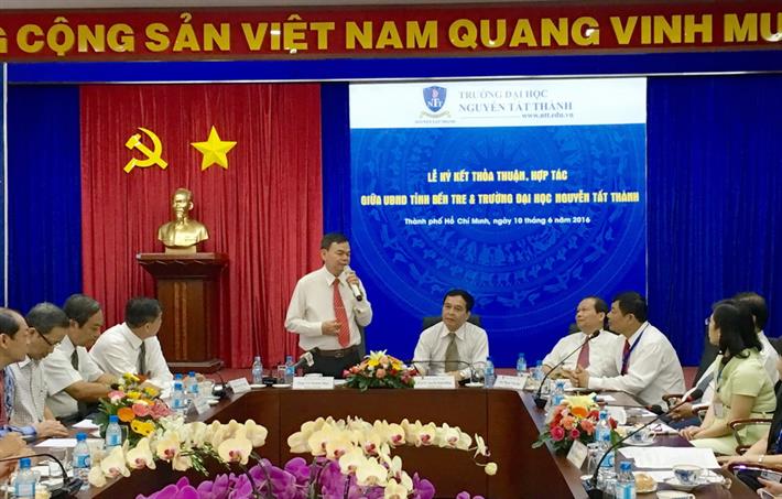 Phát biểu tại lễ ký kết, PGS.TS Nguyễn Mạnh Hùng - Hiệu trưởng Trường Đại học Nguyễn Tất Thành - cho biết: Việc ký kết chương trình hợp tác “Đồng khởi - Khởi nghiệp” giữa Trường và tỉnh Bến Tre nhằm tạo ra môi trường khởi nghiệp cho SV tỉnh Bến Tre đang theo học tại trường.