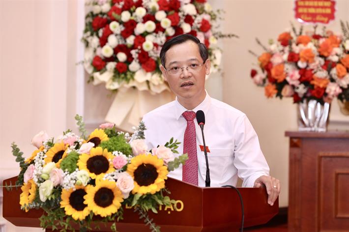 Đồng chí Hoàng Minh Sơn - Ủy viên Ban Thường vụ Đảng ủy, Trưởng Ban Tổ chức Đảng ủy, Thứ trưởng Bộ GDĐT, phát biểu chỉ đạo tại Đại hội