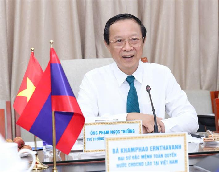 Thứ trưởng Thường trực Phạm Ngọc Thưởng và bà Khamphao Ernthavanh cùng thành viên hai bên