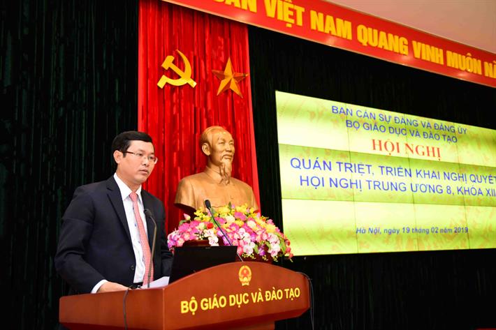 Phát biểu tại Hội nghị, đồng chí Nguyễn Văn Phúc, Phó Bí thư Ban Cán sự Đảng, Thứ trưởng Bộ GD&ĐT nhấn mạnh tầm quan trọng của việc quán triệt triển khai Nghị quyết Hội nghị Trung ương 8, Khóa XII và đề nghị cấp ủy, tổ chức đảng các cấp, lãnh đạo các cơ quan, đơn vị, các tổ chức đoàn thể trong Đảng bộ Bộ, cơ quan Bộ tập trung lãnh đạo, chỉ đạo, tổ chức quán triệt đầy đủ, sâu sắc và thực hiện có hiệu quả Nghị quyết.