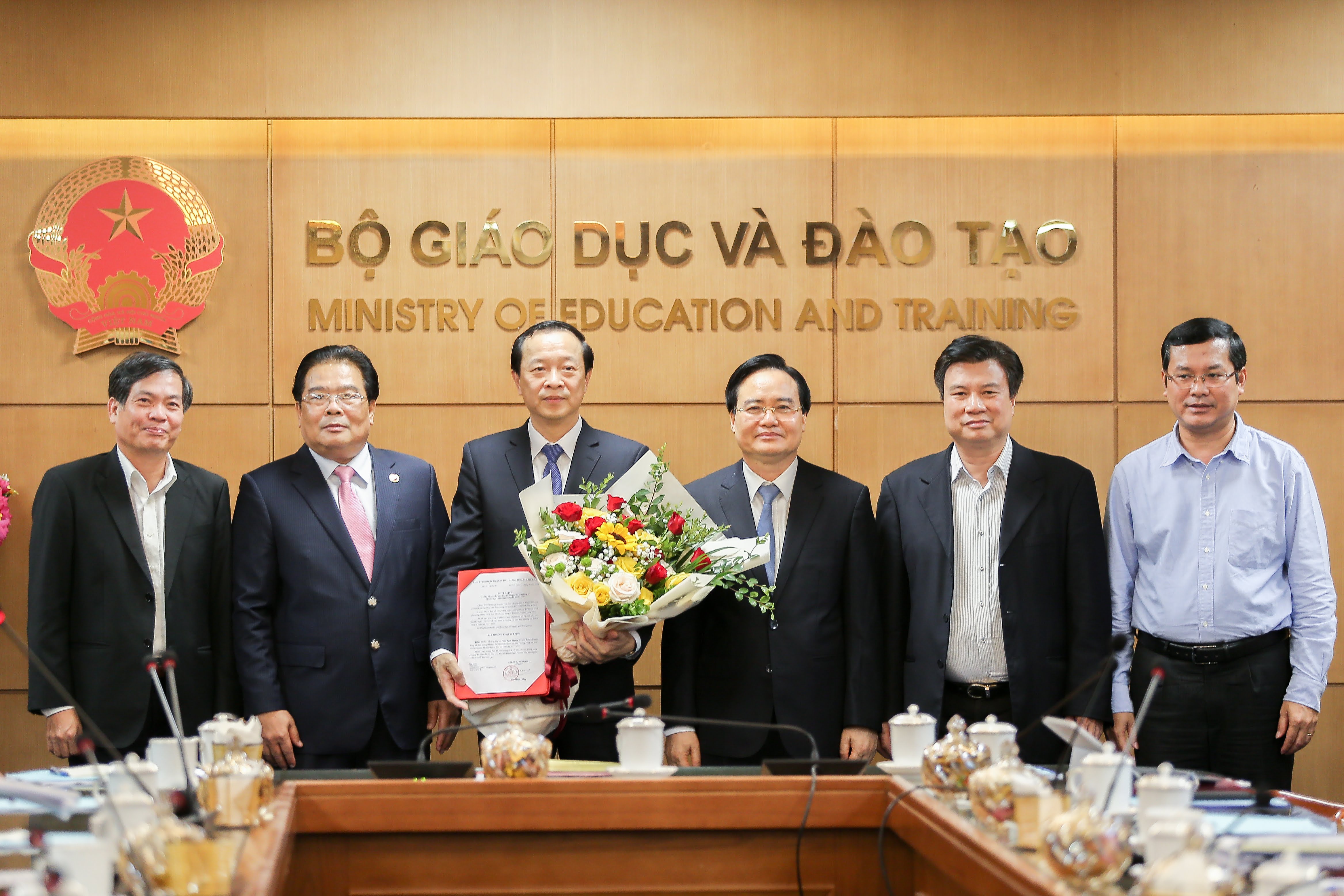 Đồng chí Sơn Minh Thắng và Bộ trưởng Phùng Xuân Nhạ chúc mừng tân Bí thư Đảng ủy Bộ GDĐT Phạm Ngọc Thưởng