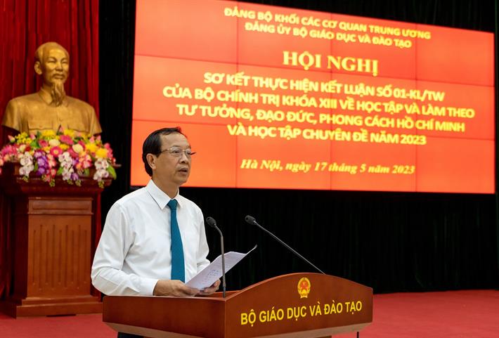 Phát biểu khai mạc Hội nghị, Thứ trưởng Phạm Ngọc Thưởng cho biết: Thực hiện Nghị quyết Đại hội XIII của Đảng, ngày 18/5/2021, Bộ Chính trị (khóa XIII) ban hành Kết luận số 01 về tiếp tục thực hiện Chỉ thị số 05 về Đẩy mạnh việc học tập và làm theo tư tưởng, đạo đức, phong cách Hồ Chí Minh. Ngay sau khi Kết luận được ban hành, căn cứ các văn bản hướng dẫn của Trung ương, của Đảng ủy Khối các cơ quan Trung ương, Ban Thường vụ Đảng ủy Bộ GDĐT đã tổ chức học tập, quán triệt và triển khai trong toàn Đảng bộ.