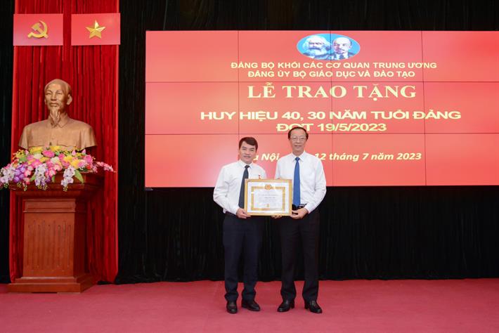 Tại Hội nghị sơ kết, Thứ trưởng Phạm Ngọc Thưởng đã trao huy hiệu 30, 40 năm tuổi đảng cho 2 đảng viên thuộc Đảng uỷ Bộ GDĐT.