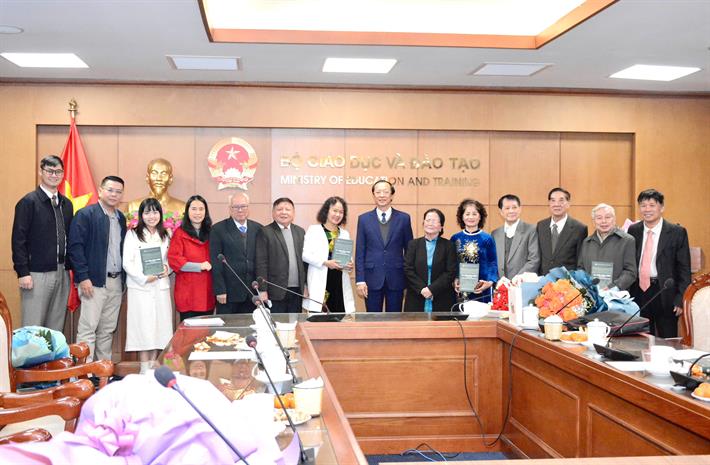 Thứ trưởng Phạm Ngọc Thưởng, gia đình cố GS.TS Trần Hồng Quân và Ban biên soạn cuốn sách