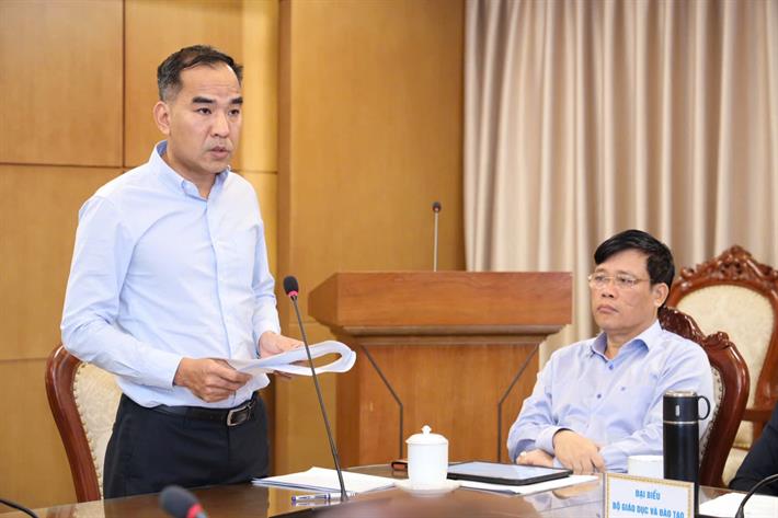 Phó Vụ trưởng Vụ Pháp chế (Bộ GDĐT) Đào Hồng Cường báo cáo kết quả phối hợp thực hiện công tác pháp chế giữa hai bộ